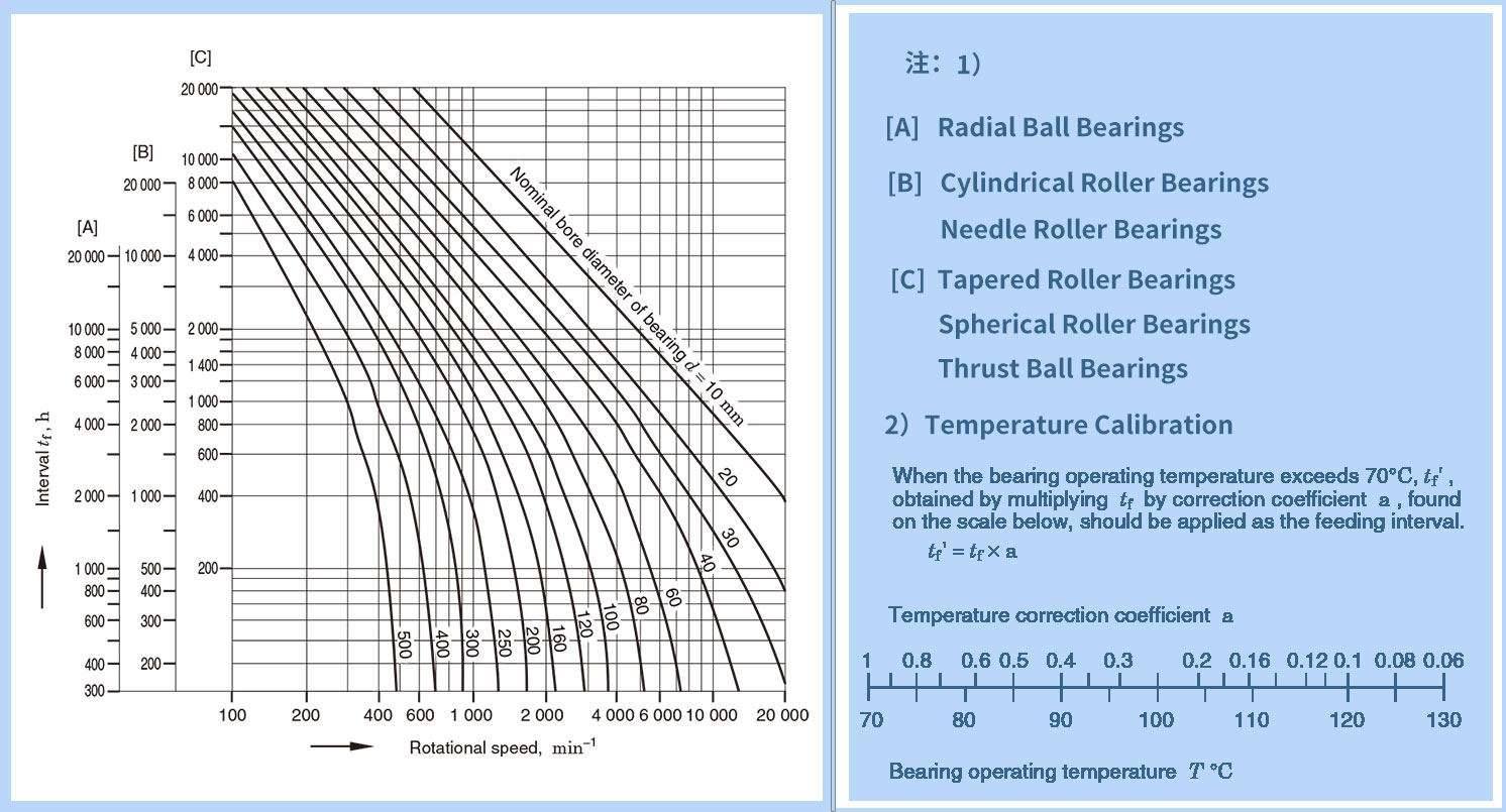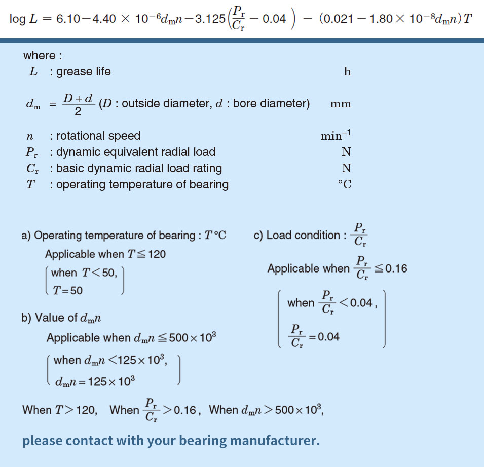 另一方面,在考慮軸承潤滑頻率的同時(shí),準確估計潤滑劑的壽命是至關(guān)重要的,對于填充有潤滑脂的密封單列深溝球軸承,潤滑脂壽命可以使用如上公式進(jìn)行估計。