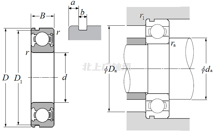 | 單列向心球軸承 - 單面密封(輕接觸式橡膠密封),帶卡環(huán)槽 - 尺寸 | |