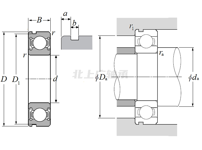 | 單列向心球軸承 - 雙面密封(非接觸式橡膠密封),帶卡環(huán)槽 - 尺寸 | |