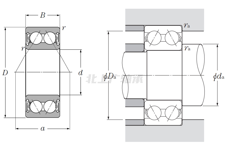 | 雙列角接觸球軸承 - 雙面密封(非接觸式橡膠密封) - 尺寸 | |