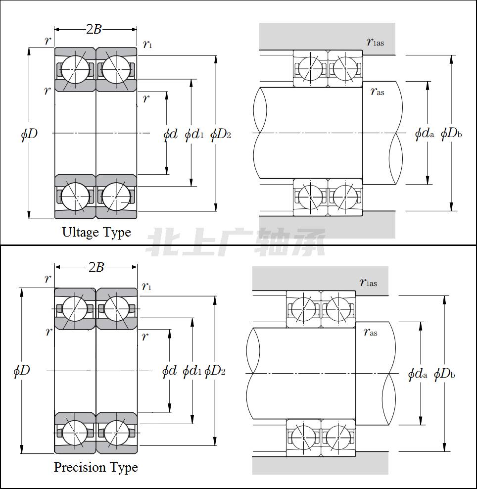 | 雙聯(lián)角接觸球軸承 - 背對背配對 - 尺寸 | |