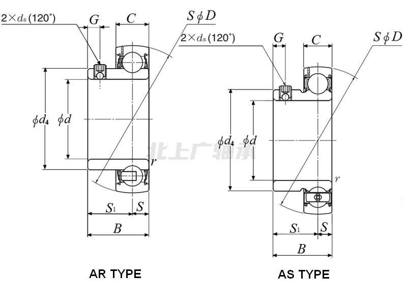 前綴列表:【AS:AS 系列外球面球軸承,帶止動(dòng)螺釘】,后綴列表:【D1:帶潤滑油孔】
