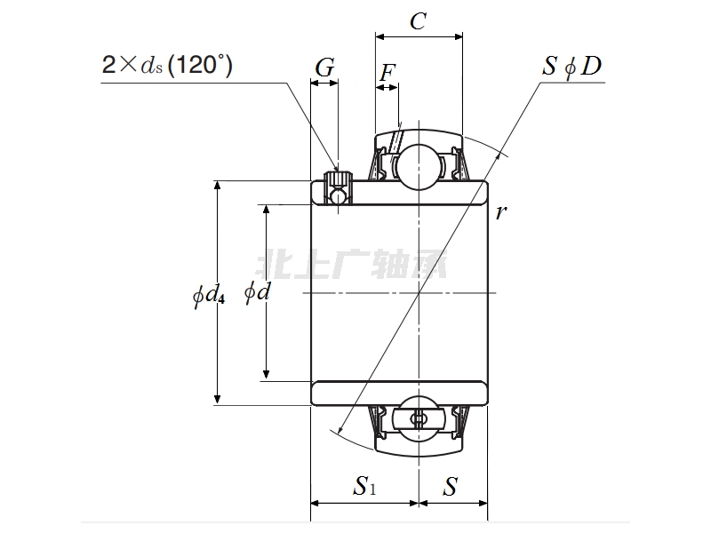 前綴列表:【U:外球面球軸承】【C:內圈內孔為圓柱孔,帶止動(dòng)螺釘】,后綴列表:【D1:帶潤滑油孔】