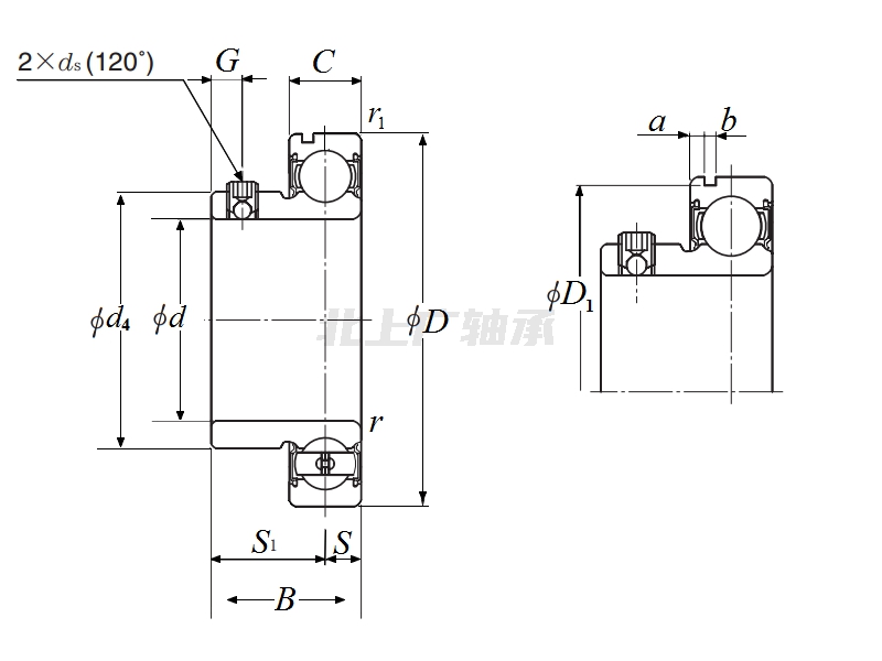 前綴列表:【AS:AS 系列外球面球軸承,帶止動(dòng)螺釘】【S:外圈外表面為圓柱形】,后綴列表:【N:帶止動(dòng)槽】