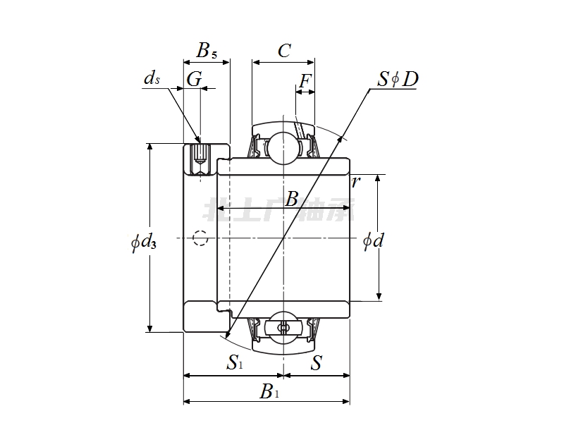 前綴列表:【A-:潤滑孔設在鎖緊設備的另一側】【UEL:UL 系列外球面球軸承 + EL 偏心套圈】,后綴列表:【D1:帶潤滑油孔】