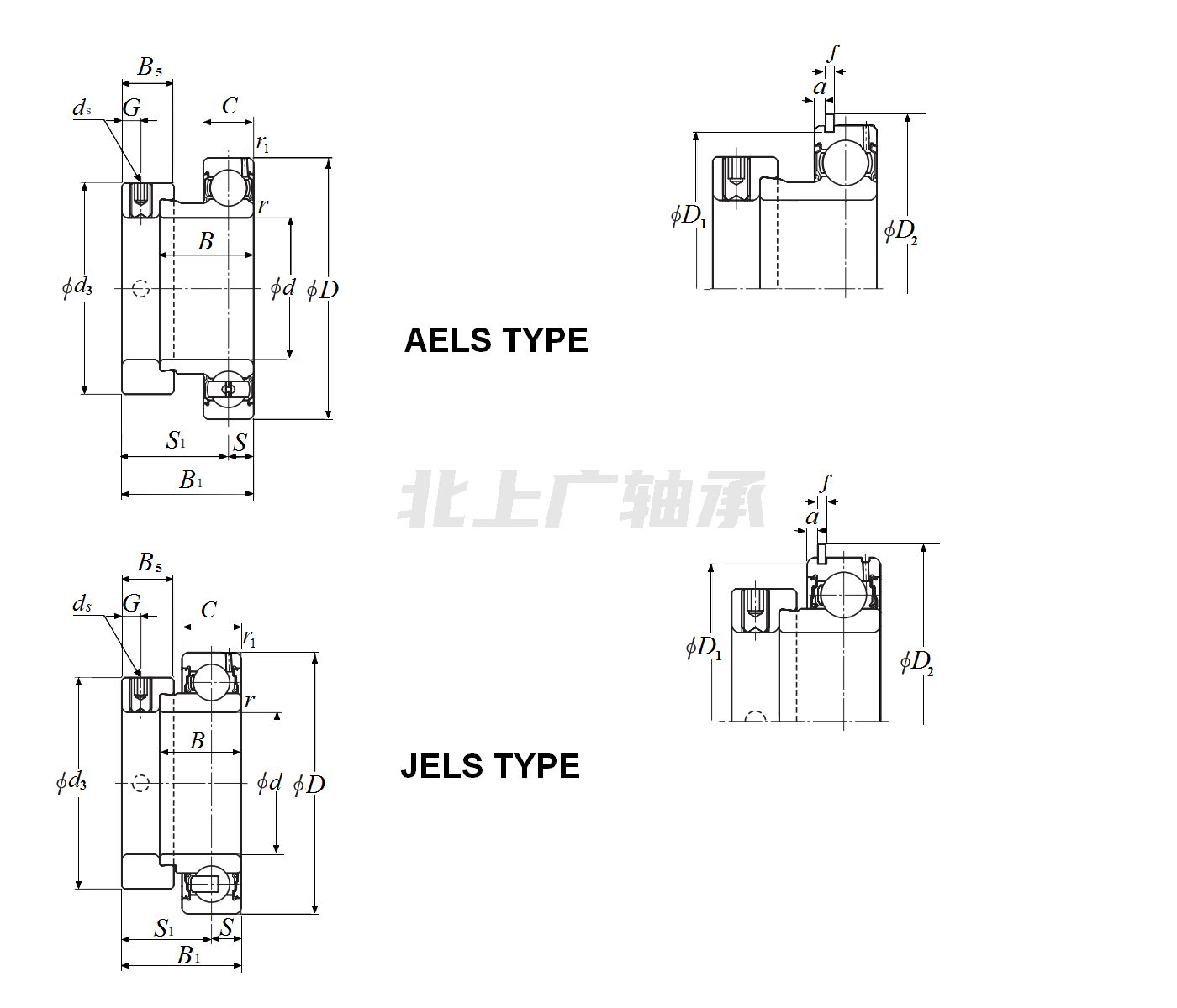前綴列表:【AEL:AL 系列外球面球軸承 + EL 偏心套圈】【S:外圈外表面為圓柱形】,后綴列表:【D1:帶潤滑油孔】【N:帶止動(dòng)槽】