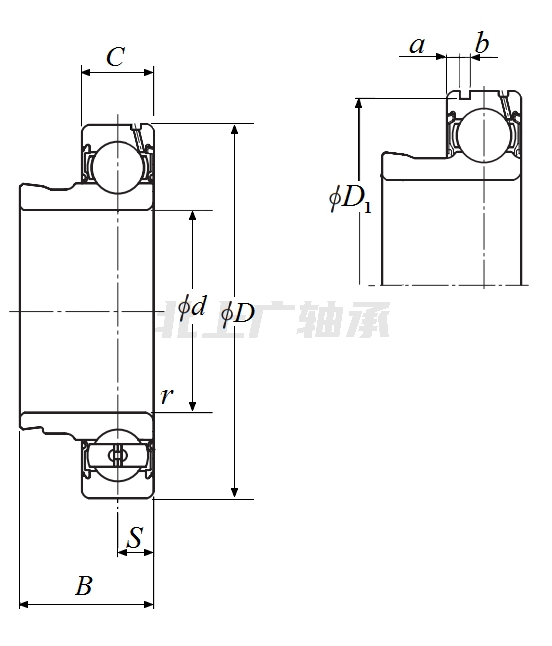 前綴列表:【AL:AL 系列外球面球軸承】【S:外圈外表面為圓柱形】,后綴列表:【N:帶止動(dòng)槽】