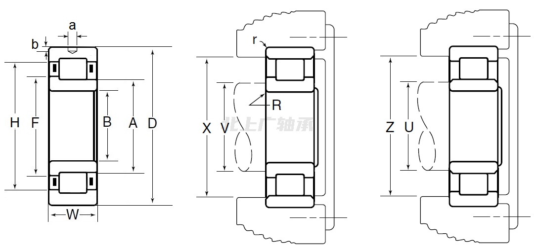前綴列表:【M:Bower 系列圓柱滾子軸承】【R:內圈單擋邊,內圈可分離】,后綴列表:【E:外圈雙擋邊】【L:復合鋼保持架】