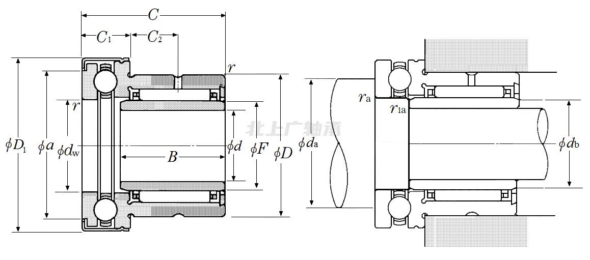 | 帶推力球軸承的滾針軸承,帶內圈及端蓋 - 尺寸 | |