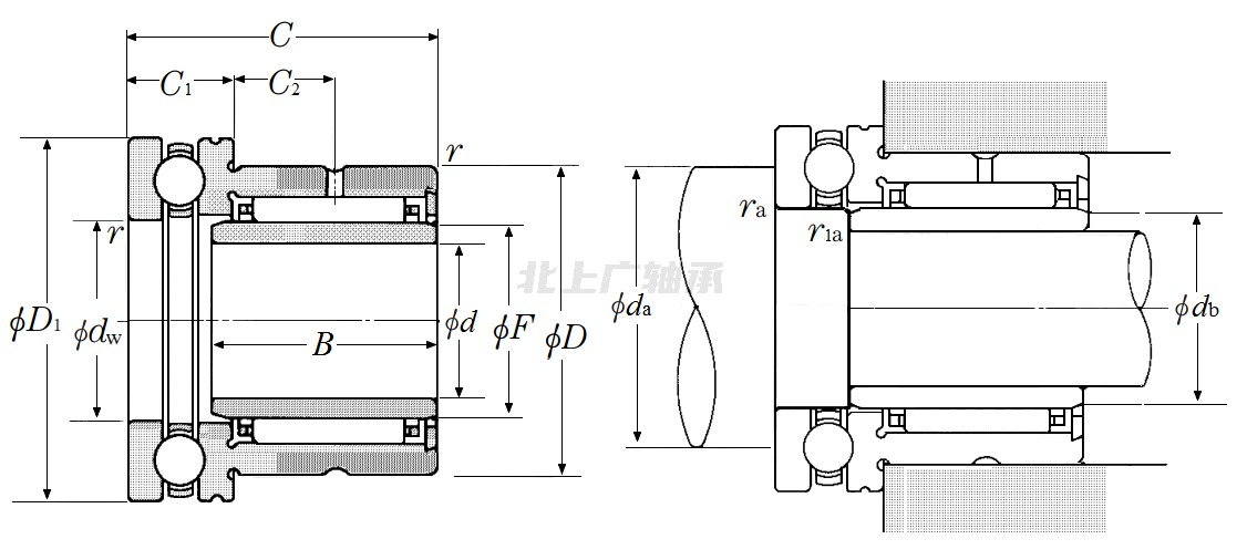 前綴列表:【NA:滾動(dòng)體為滾針】,后綴列表:【X:外圈表面為圓柱形】【LL:兩側有接觸式密封圈】