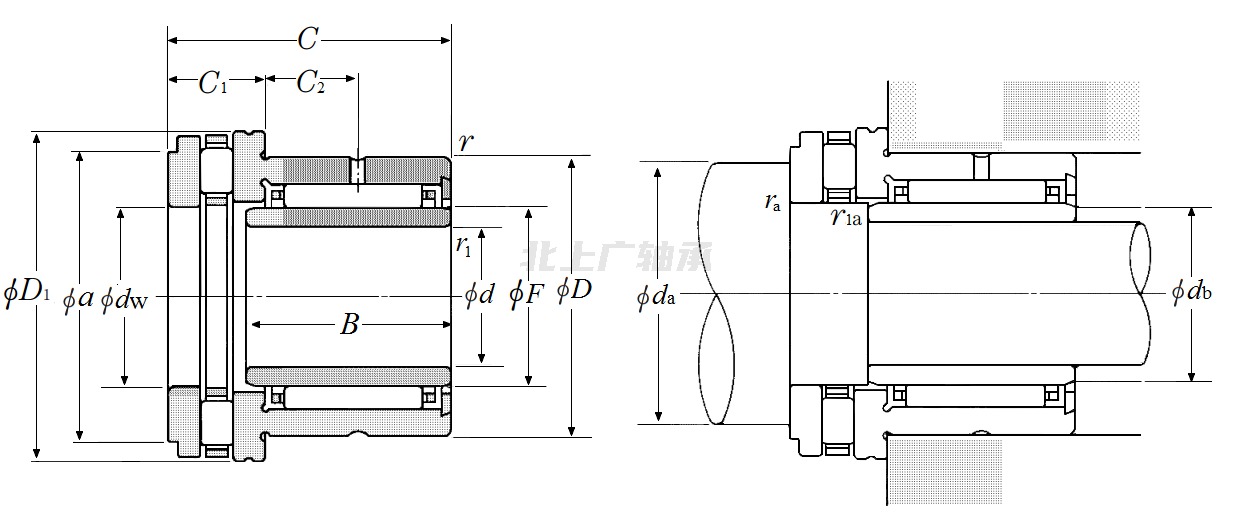 前綴列表:【NA:滾動(dòng)體為滾針】【B:內外圈與保持架滾針組件,可分離型支承滾輪軸】,后綴列表:【X:外圈表面為圓柱形】