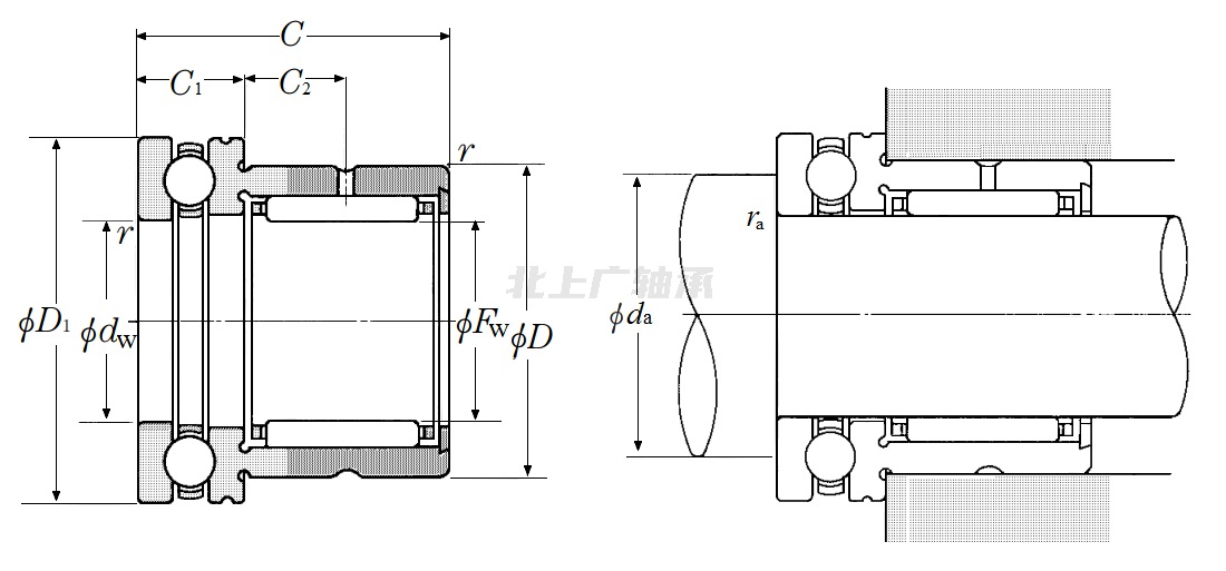 前綴列表:【NA:滾動(dòng)體為滾針】【CV:英制尺寸的滿(mǎn)裝滾子滾輪軸承】,后綴列表:【X:外圈表面為圓柱形】