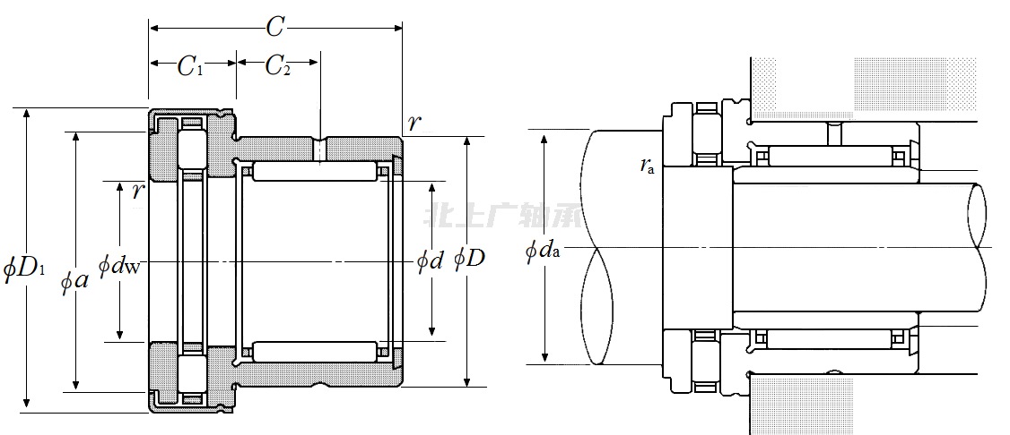 前綴列表:【NA:滾動(dòng)體為滾針】【CV:英制尺寸的滿(mǎn)裝滾子滾輪軸承】,后綴列表:【X:外圈表面為圓柱形】【LL:兩側有接觸式密封圈】