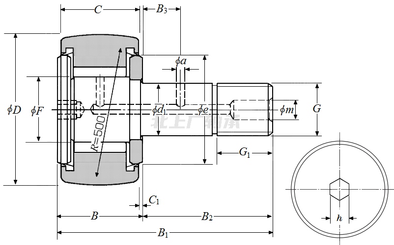 前綴列表:【CR:英制凸輪從動(dòng)軸承(螺栓滾輪軸承)】【V:滿(mǎn)裝滾子型】,后綴列表:【H:與 SK 同,螺柱型凸輪從動(dòng)件,帶六角孔】