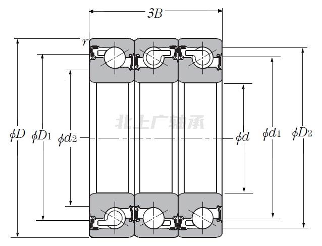 | 滾珠絲杠用三列角接觸推力球軸承 - DBT 配對,雙面密封,兩列承受軸向載荷 - 尺寸 | |