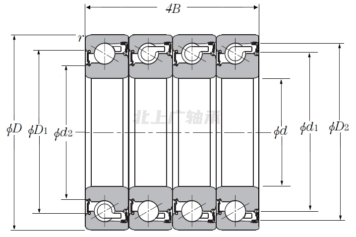 | 滾珠絲杠用四列角接觸推力球軸承 - DTTT 配對,雙面密封,四列承受軸向載荷 - 尺寸 | |