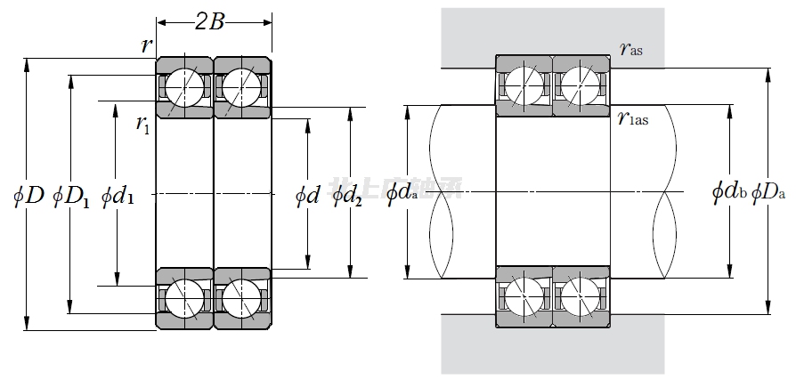 | 雙列角接觸球軸承,電機和車(chē)床用 - 串聯(lián)配對 - 尺寸 | |