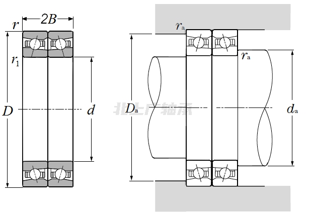 | 超高轉速雙聯(lián)角接觸球軸承,背對背配對 - 尺寸 | |