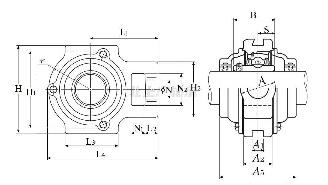 | 滑塊型軸承座,鑄造外殼,帶緊定螺釘,鑄造防塵蓋,開(kāi)式,UCT型 - 尺寸 | |
